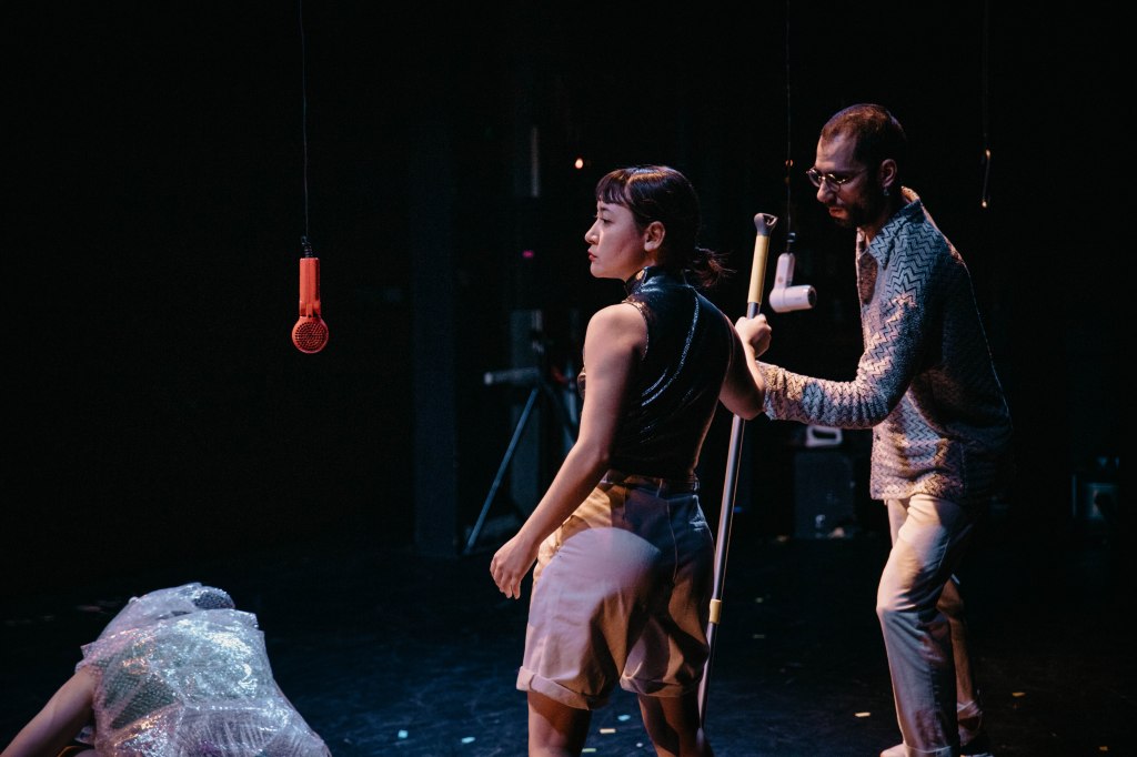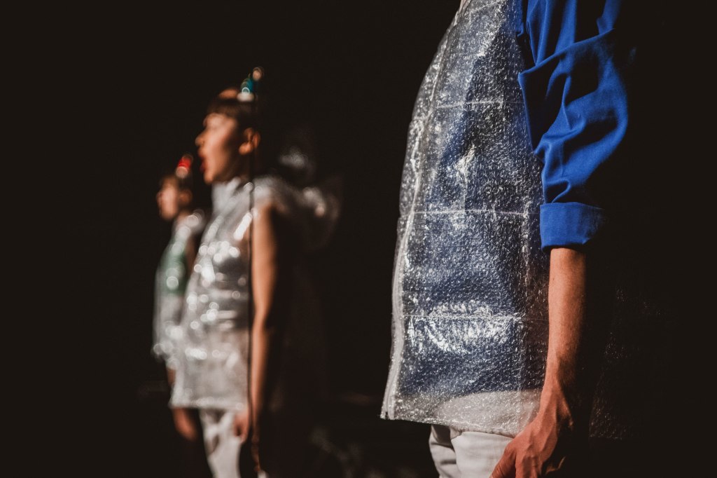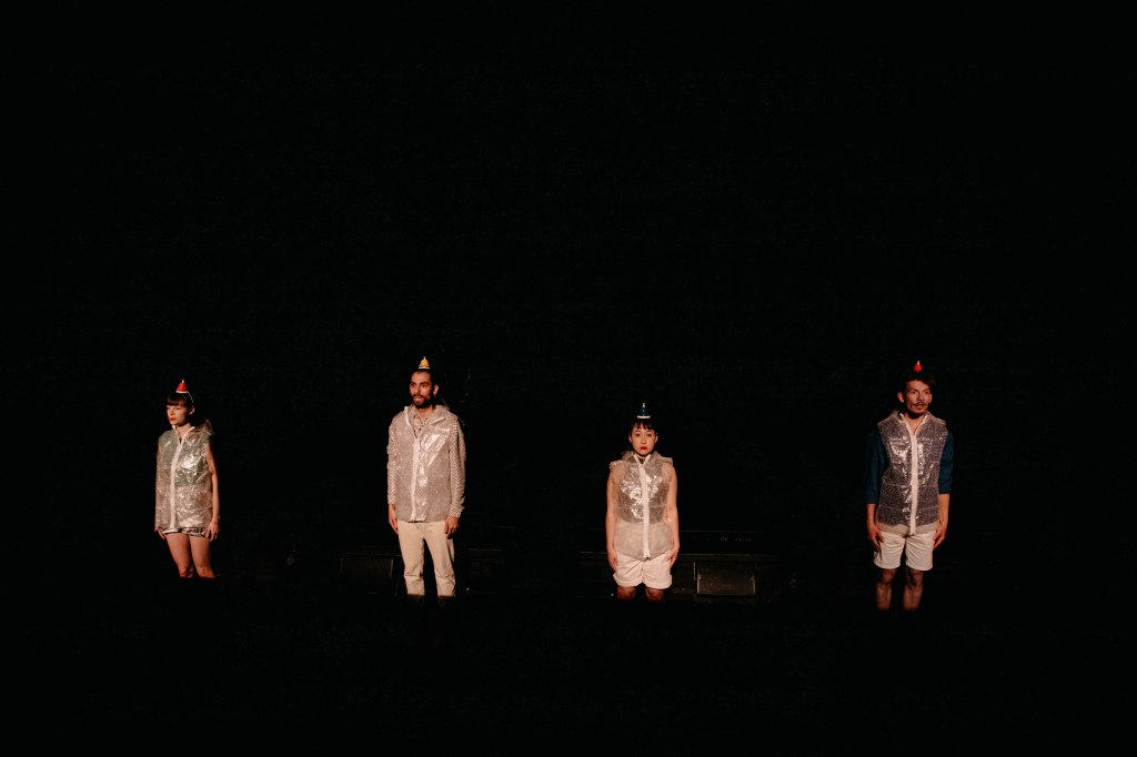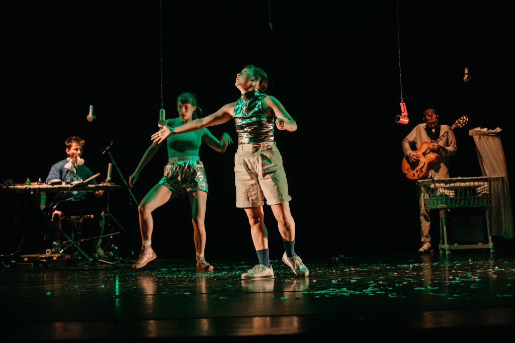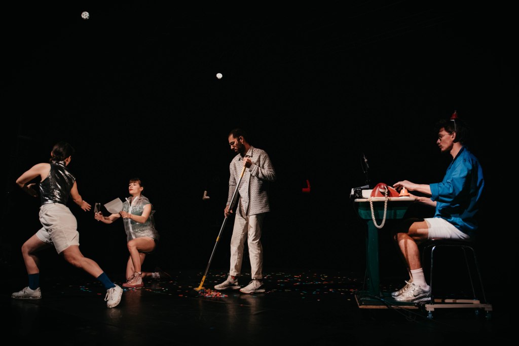 “Vivons heureux avant la fin du monde” est une création musicale et chorégraphique. Avec humour et dérision, elle tente de nous placer face à un miroir grossissant reflétant ce qui se trouverait à la source de notre passivité et nos incohérences en lien à la crise écologique. Au plateau, danse et musique se relaient dans un enchaînement de tableaux sillonnant entre absurdité, loufoque, contradictions et trop-plein. Les corps y incarnent nos incohérences, les gestes et les sons questionnent nos obsessions pour la technologie dans une ambiance à la Jacques Tati, les danses s’emballent dans une musique glissant vers la “noise”, confrontant la perspective de l’humain se dirigeant droit dans le mur. Sans jamais vouloir donner de leçon, ce quatuor rit de nos excès tout en défoulant nos préoccupations.